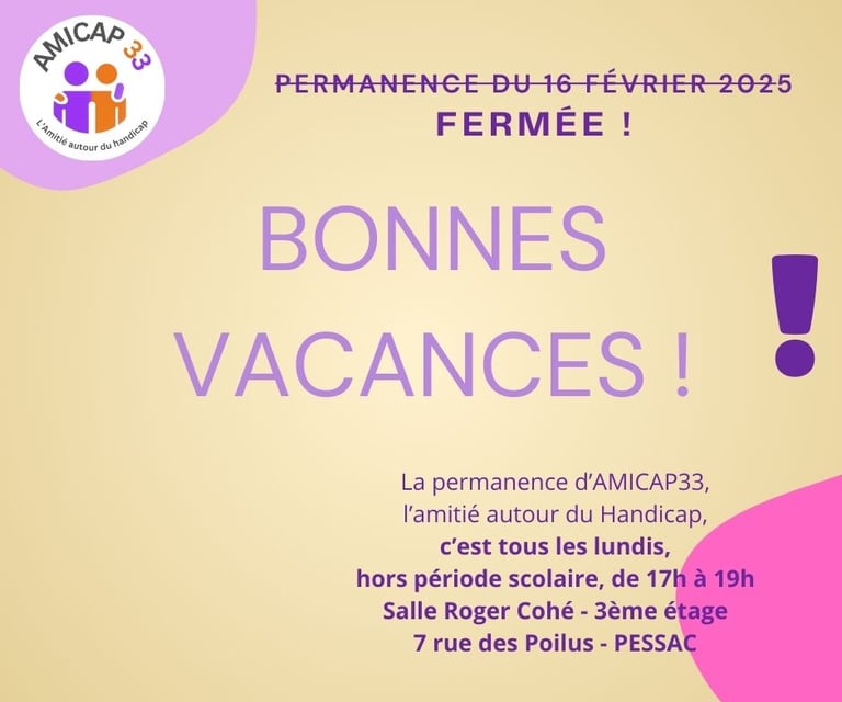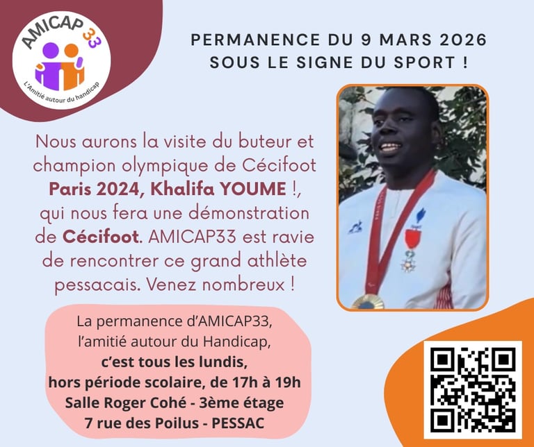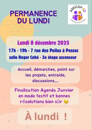Tous les lundis, AMICAP33 t’accueille pour t’aider dans tes démarches, répondre à tes questions en lien avec un handicap, à l’école, en études, au travail ou tout simplement te présenter l’asso, notre mode de fonctionnement, nos activités et projets.