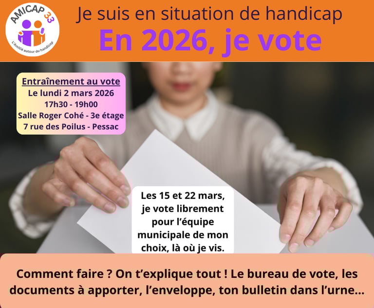 Tu es en situation de handicap et tu aimerais voter cette année ? Viens poser tes questions et t'entraîner avant le 15 mars !